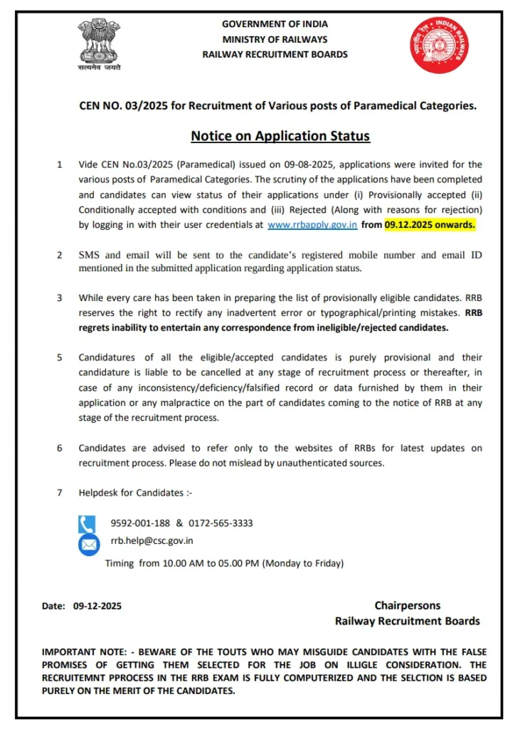 RRB Paramedical Application Status 2025; Railway Recruitment Board (RRB) has released the official “Notice on Application Status” for CEN No. 03/2025 (Paramedical Categories) on 8th December 2025. The notice says that the candidates will be able to check whether their applications have been accepted, conditionally accepted, or rejected for various paramedical posts from 9th December 2025 onwards. An SMS and email will also be sent to the candidate’s registered mobile number and email ID regarding the status of their application.